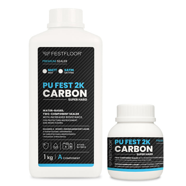 PU FEST 2K CARBON sealer (1 kg component A + 0.1 kg component B) – a two-component protective sealer for microcement. Offers high resistance to abrasion and stains. The product is sufficient for one coat. For best results and durability, we recommend applying two coats. Select the option with sealer for the second coat to achieve full surface protection.